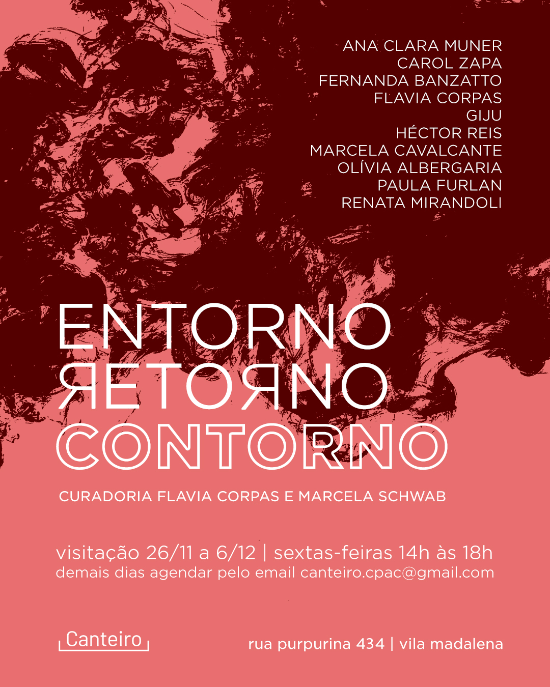 Ao longo de quatro meses, o grupo de artistas investigou temas como memória, relação entre palavra e imagem, os modos de vida contemporâneos e as (im)possibilidades da representação. Cada artista se lançou ao desafio inerente à prática artística: se deixar atravessar pelo seu entorno, acolhendo o retorno do que insiste como falta ou excesso, permitindo que palavras e imagens instaurem um novo contorno, território onde a vida pode seguir sendo sempre invenção.