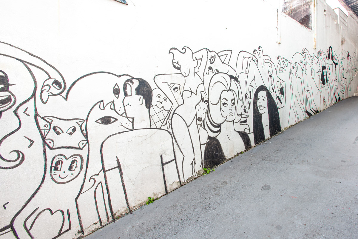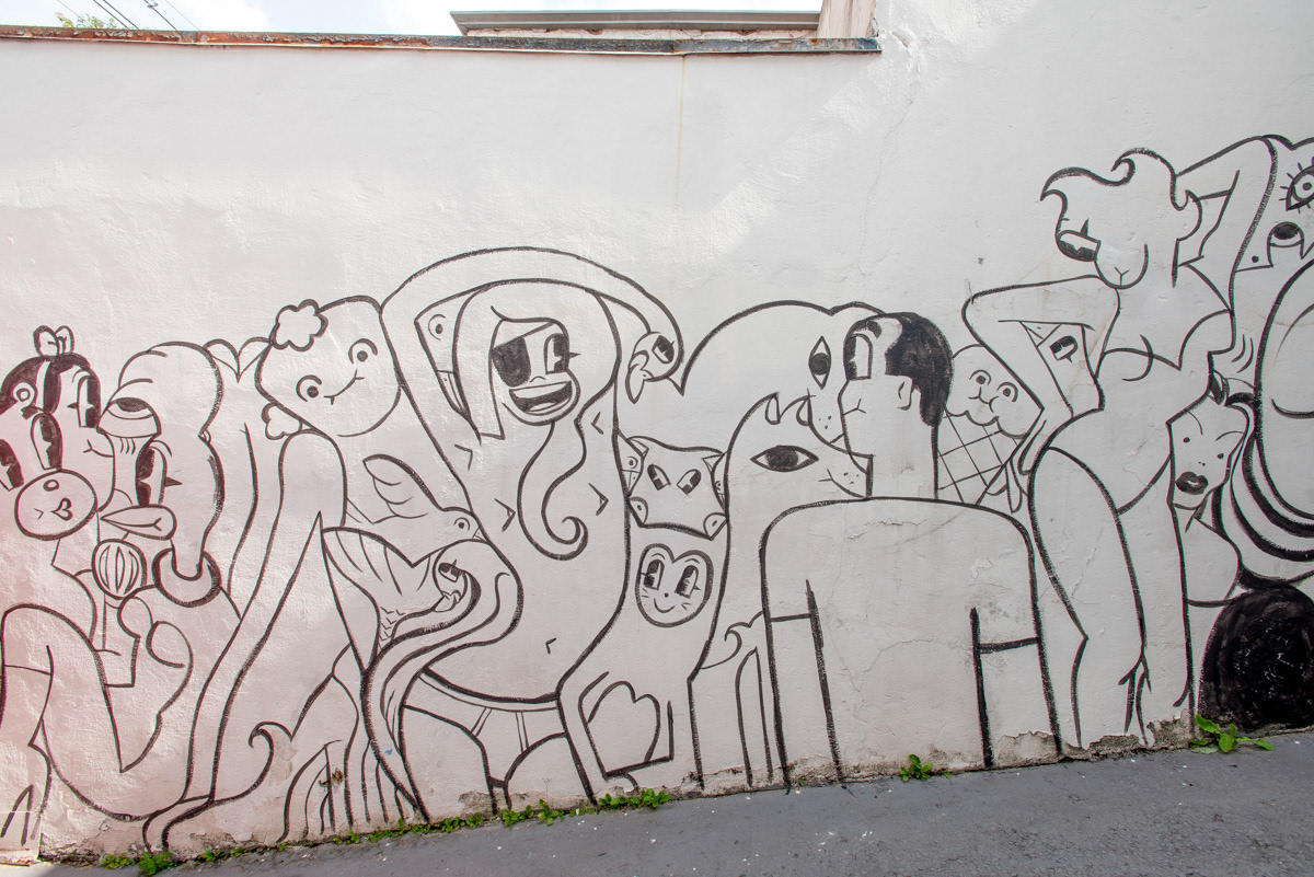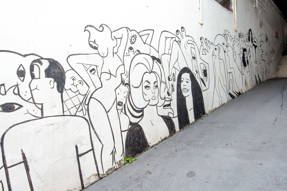 A terceira edição do Projeto Rampa conta com a participação de Caio Borges. O artista apresenta Paredéaum, um mural repleto de figuras e personagens compostas em um amálgama de corpos.
