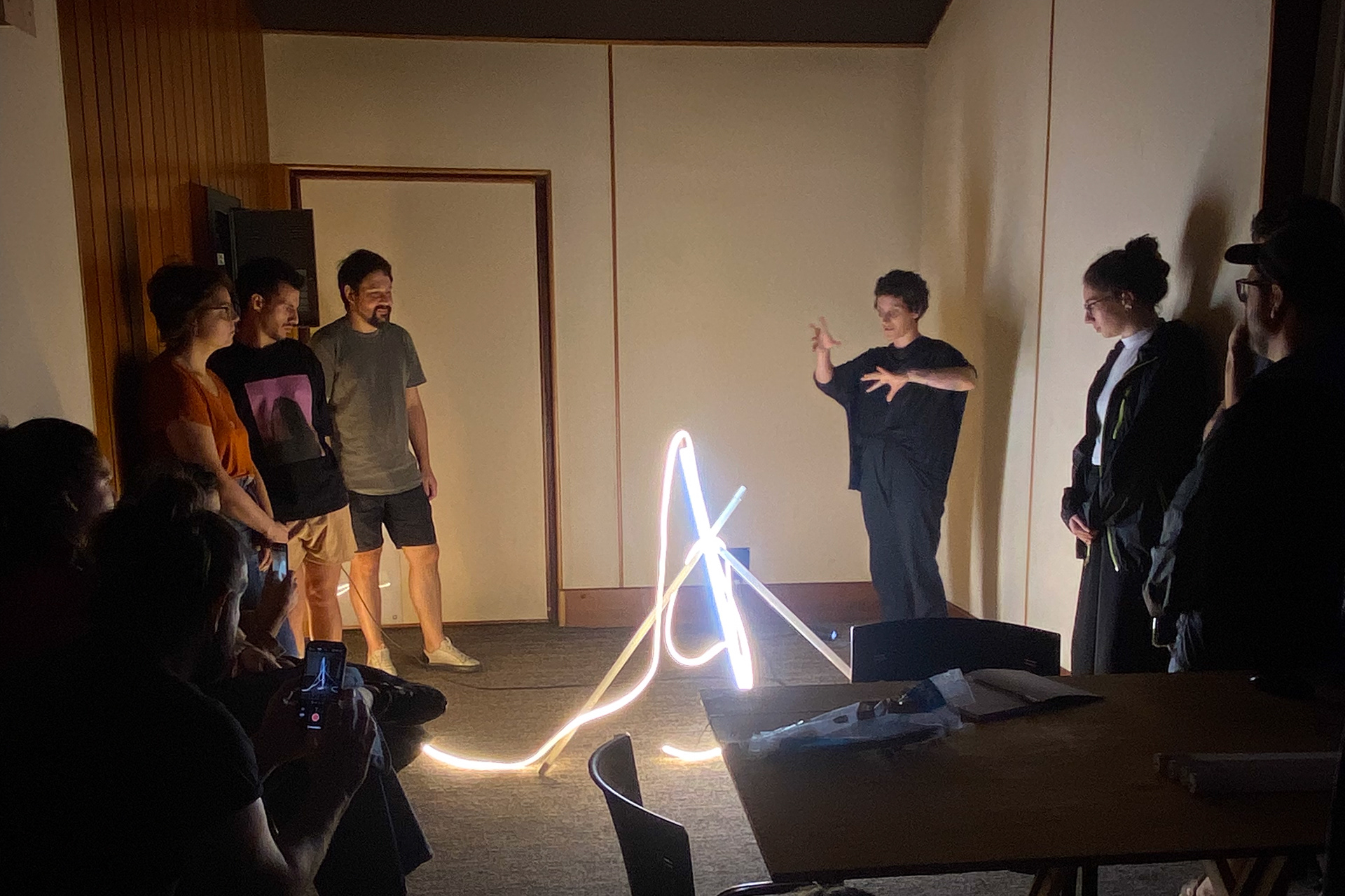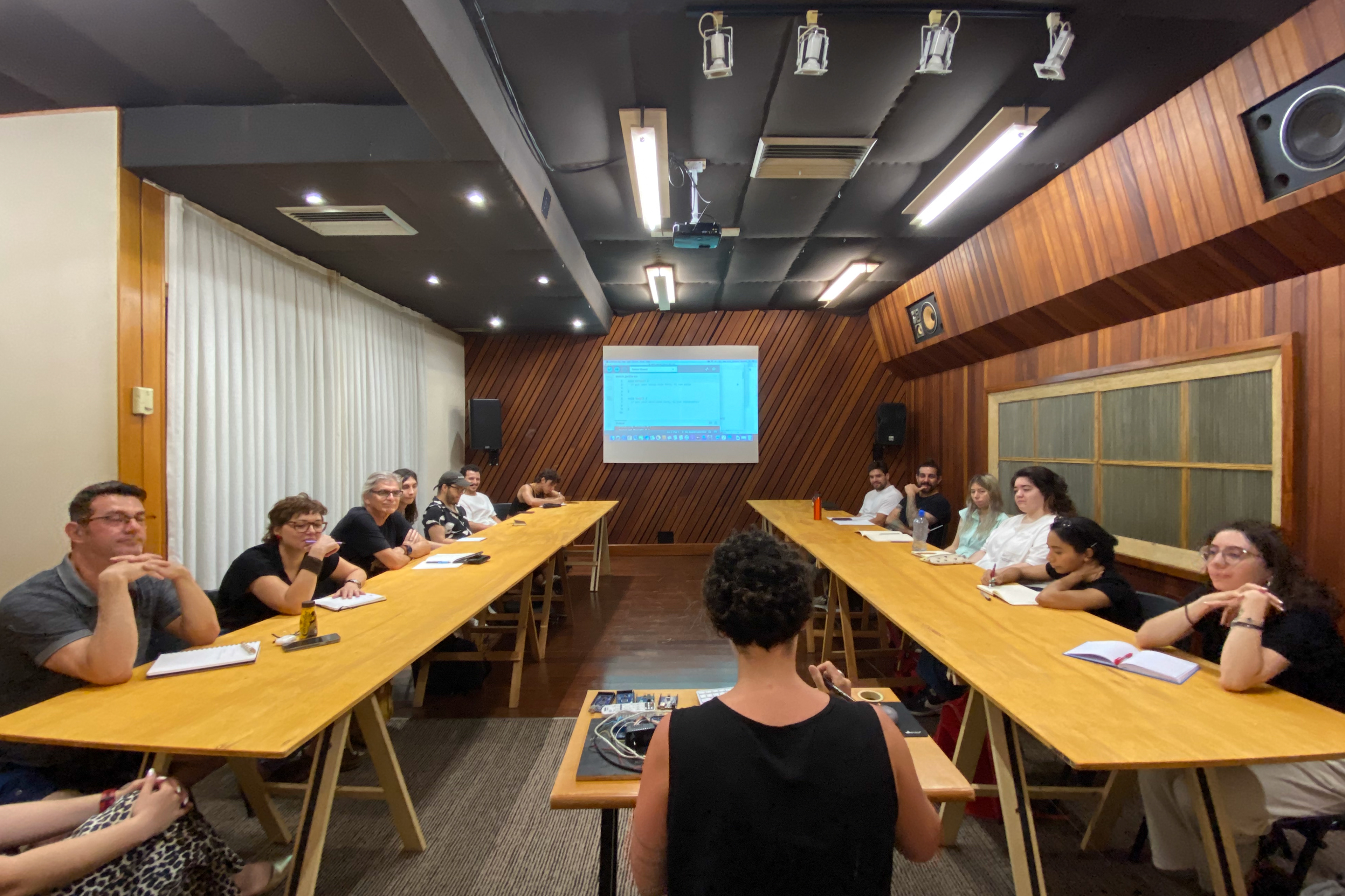 We maintain a physical infrastructure consisting of a sound-treated studio and an exhibition space, where both the educational activities and final course exhibitions take place. In this way, we invest in supporting the entire creative process of each artist, from conception and production to installation and reflection on the spatial relationships of the works within the exhibition environment.